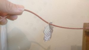 穴は一つでもいいんですが、穴が一つの時は紐を通すと、このように横向きになってしまいます。