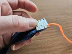 ファスナーのスラースの頭側はボンド(or両面テープ)を付けて上の矢印から下の矢印の方へ折っておく(裏側に)